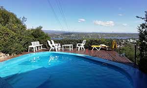 Casa para 4, de 2 Dormitorios, estar comedor, cocina, TV, Wi Fi, jardín, asador, pileta y cochera. Gran vista al lago y las sierras.